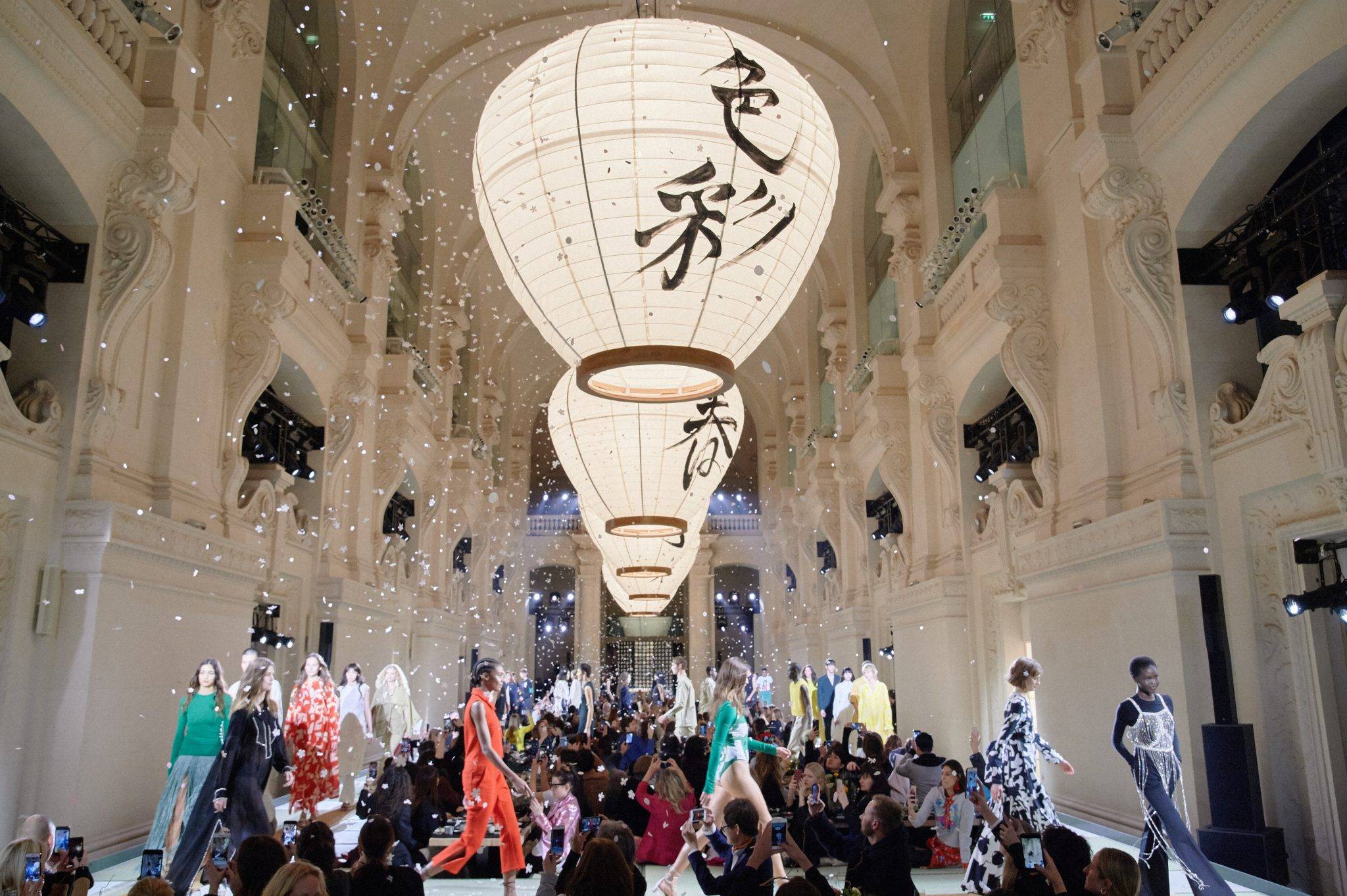 Décidément, les dîners-défilés ont la part belle cette saison. Alors que la veille Kenzo invitait une poignée de privilégiés à un dîner fastueux en hommage au Douanier Rousseau à la Monnaie de Paris, H&M Studio a placé la barre bien haut ce 28 février en conviant les personnalités les plus en vogue de Paris et d’ailleurs à prendre place au coeur de la nef du MAD Paris. Dans une scénographie plus vraie que nature en hommage à la culture japonaise (grandes tables basses, lampions géants et tatamis graphiques), les mannequins défilent devant des invités agenouillés. Même avec ce seating non conventionnel pour les habitués du front row, on ne s’étonne pas d’y croiser toute l’aristocratie du défilé de mode, d’Alexa Chung à Alek Wek en passant par Pierre Niney et Marie-Ange Casta. S’y ajoutent quelques nouveaux venus dans la sphère mode, comme l’acteur Charlie Heaton repéré dans la série Stranger Things, ou la jeune Anaïs Gallagher qui n’est autre que la fille de Noel Gallagher du groupe Oasis. Au menu: mode, sushi et confetti.