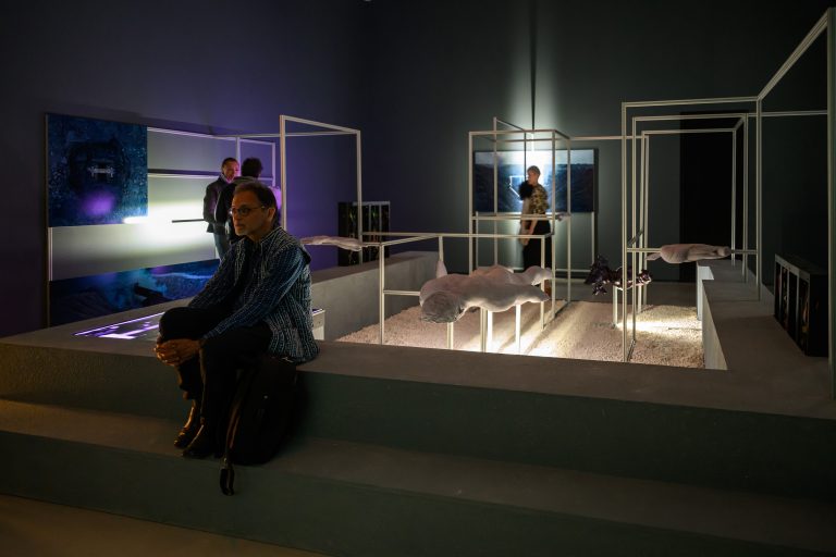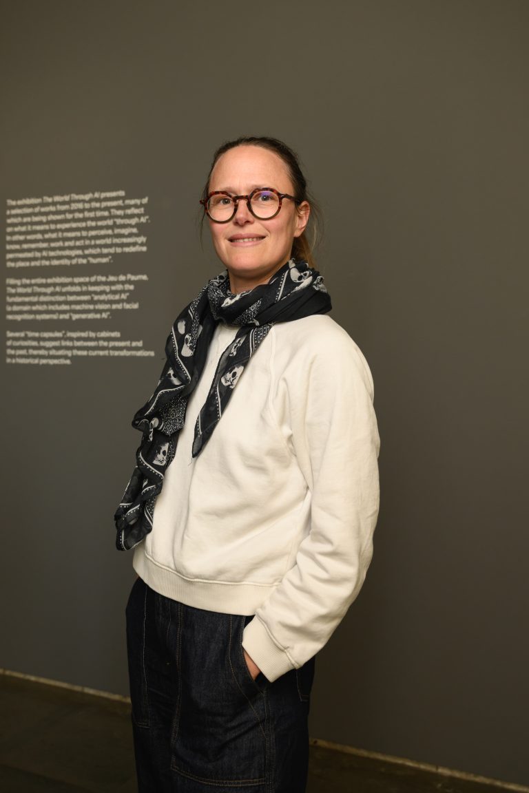 Cette présentation est la première exposition collective de cette ampleur à explorer de manière aussi approfondie les interactions entre l’intelligence artificielle et la création artistique, en embrassant une variété de médiums comme la photographie, le cinéma, les installations vidéo, la sculpture, la littérature, la musique. L’exposition ne se limite pas à présenter des œuvres générées par l’IA, elle invite les visiteurs à une réflexion sur les enjeux sociétaux, politiques et environnementaux liés à ces technologies. Elle interroge, entre autres, l’impact de l’IA sur les images et la culture visuelle, la question de la surveillance et les inégalités liées à sa production. Les visiteurs sont invités à vivre dans un monde selon l’IA ou à travers l’IA (« through AI ») et à interroger ce que cela signifie percevoir, imaginer, comprendre, transformer, se souvenir d’un un monde de plus en plus traversé par les technologies de l’IA. Lors de l’inauguration, nous avons notamment croisé le commissaire général Antonio Somaini, aux côtés des artistes exposés Kate Crawford & Vladan Joler, Agnieszka Kurant et Christian Marclay, mais aussi Louis-Gabriel Nouchi, Chris Dercon, Alexandre Samson…