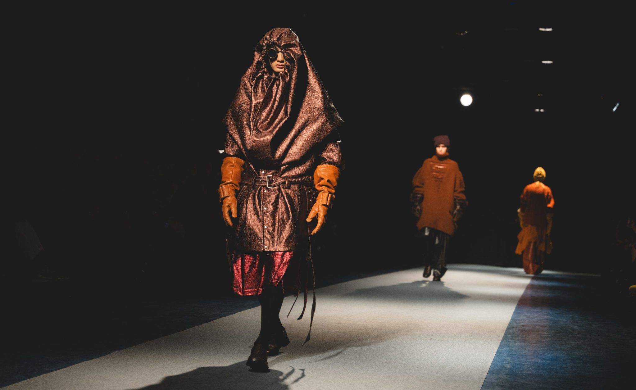 Pour son défilé Automne-Hiver 26-27, Songzio frappe fort. Portée par des campagnes à la créativité visuelle remarquable, la marque coréenne a présenté mercredi 21 janvier dernier un nouvel univers singulier, intitulé “Crushed Cast Constructed”. Sous les arcades en pierre du pont Alexandre III s’est ainsi dévoilé un monde post-apocalyptique déstructuré et futuriste. Pantalons de cuir tailladés, bottes à l’ouverture torsadée, cagoules, longs manteaux et lunettes steampunk : voilà la mode d’une civilisation tout droit sortie d’une série de science-fiction. On y note l’omniprésence du cuir et une domination presque absolue des couleurs sombres. Comme une rébellion contre toute forme de limites, les silhouettes sculpturales se dessinent au travers de superpositions infinies. Une mode audacieuse, que Jay Songzio déconstruit, fragmente et recompose à foison.