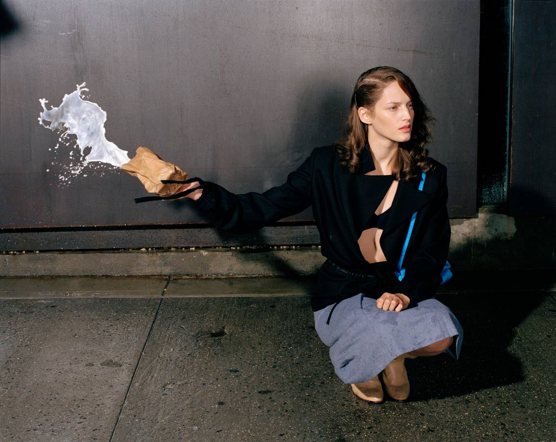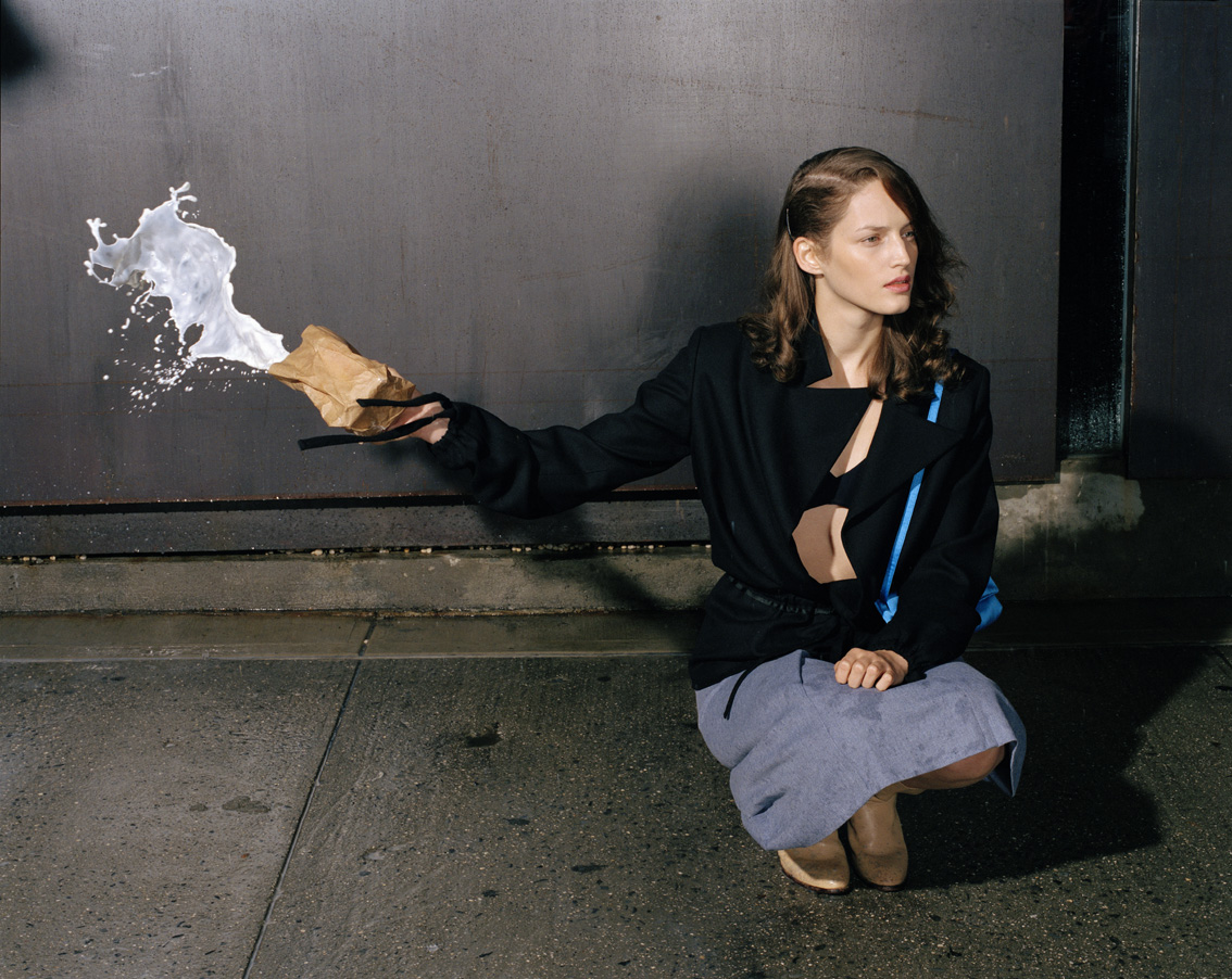 Prenez la série Life Moves Fast, New York (1999/2008). Je l’ai réalisée pour le magazine i-D qui, à l’époque, proposait quelque chose de très novateur en matière de thèmes et de photographie. Le concept de l’éditorial était « le mouvement », mais au lieu de faire bouger la mannequin, je l’ai fait s’asseoir, et j’ai animé l’environnement autour d’elle. Nous avons utilisé toutes sortes de choses, un sac en nylon, une voiture de course jouet, et même un chien qui se trouve dans l’un d’entre eux.