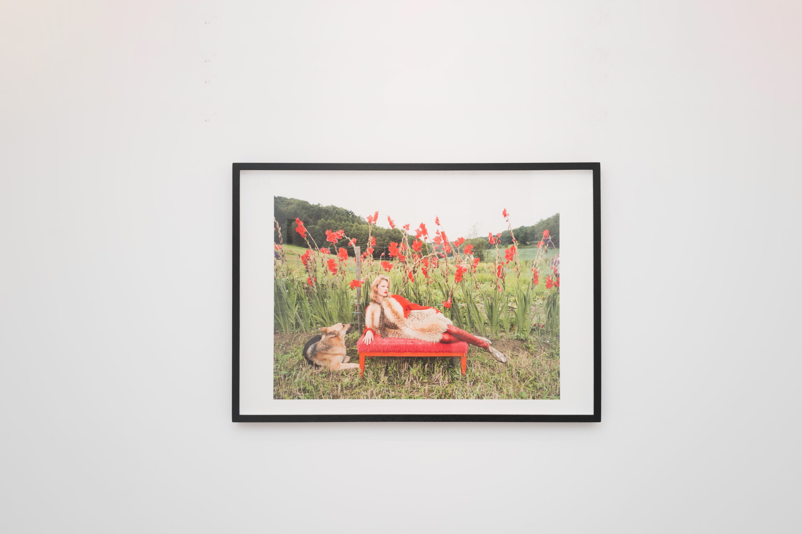 On peut le dire, oui. L’exposition témoigne également de l’improvisation et de l’esprit ludique de mes photographies. Pour BGLD par exemple, tout est parti d’un simple manteau de fourrure que nous transportions dans une camionnette pleine de palmiers un peu kitsch. En roulant dans la campagne, j’ai repéré un champ magnifique et j’ai pensé à mettre en scène une prise de vue. Mon styliste a apporté un petit meuble, qui contrastait fortement avec l’arrière-plan, puis le chien de la mannequin est soudainement entré dans le champ de la caméra. Tout s’est enchaîné : il avait l’air d’être parfaitement à sa place, ce qui rendait l’image encore plus abstraite, mais aussi plus légère. Ce sont souvent des imprévus de ce genre qui font qu’une image fonctionne.