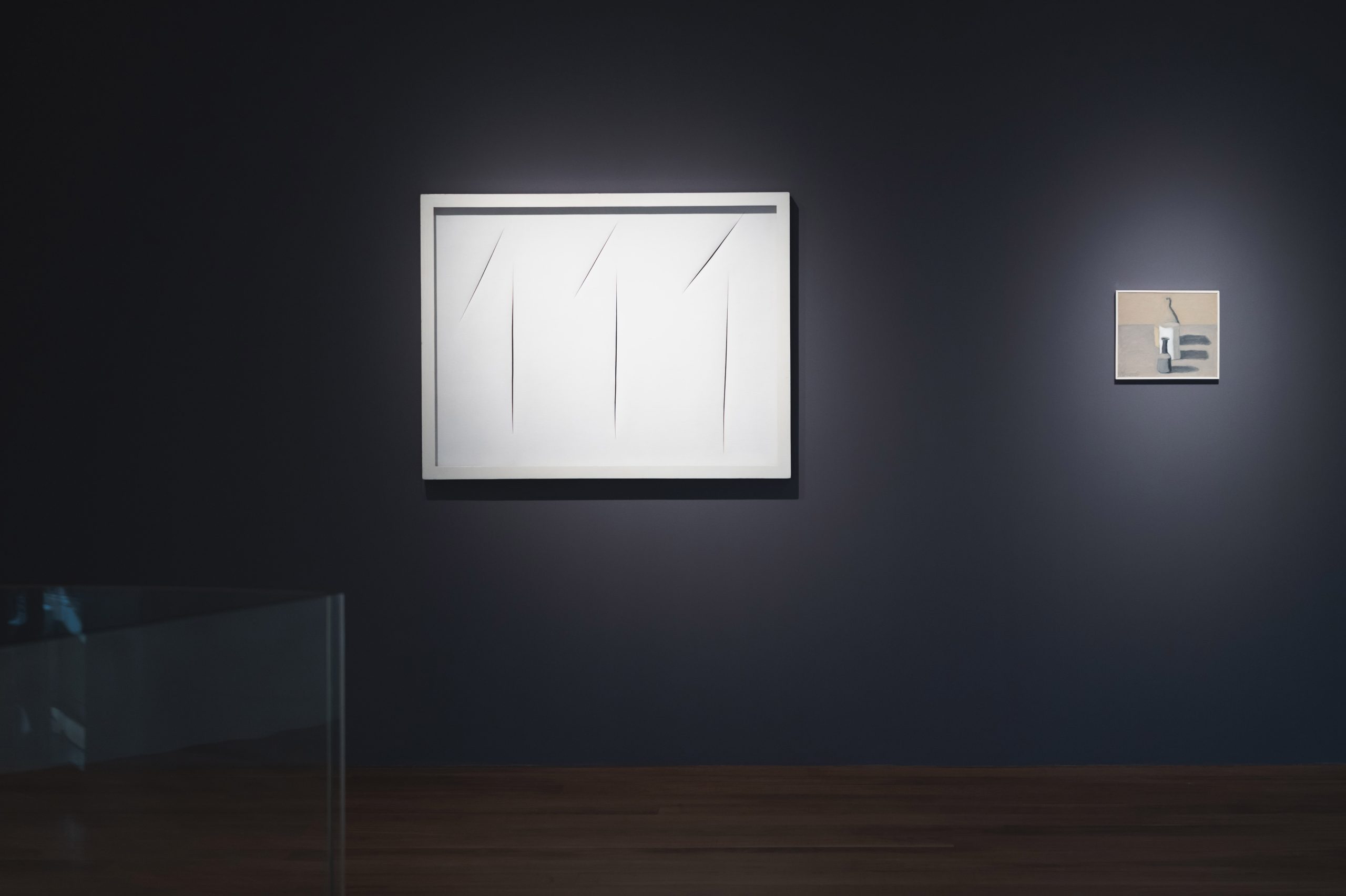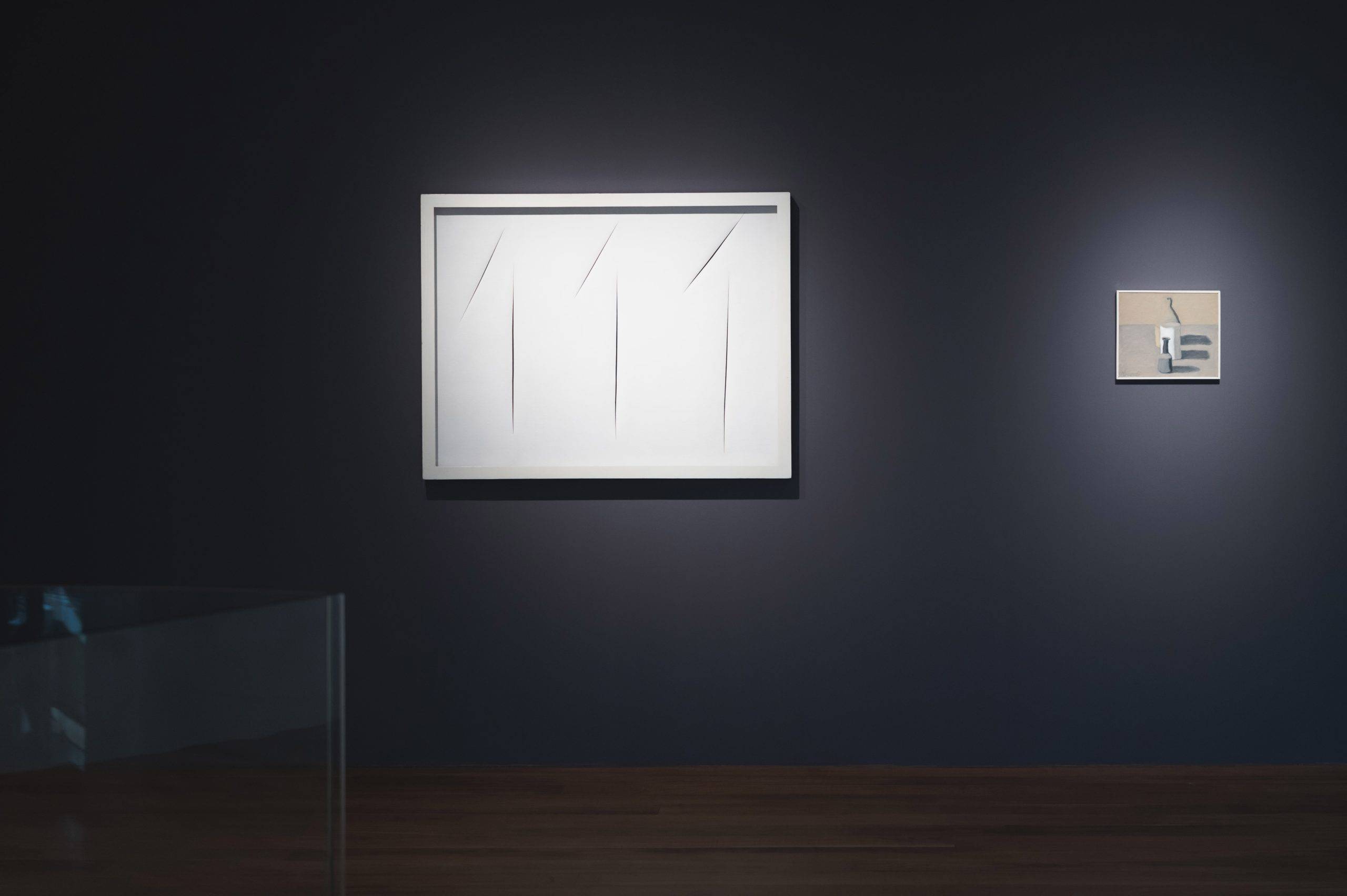 Morandi et Fontana sont deux piliers de l’art italien du XXe siècle. Le titre de l’exposition fait référence à leur recherche commune qui tend vers ce qui se situe au-delà du visible. Morandi, avec ses natures mortes infiniment méditatives, a exploré les variations subtiles de la lumière et de la forme, dans une quête à la fois poétique et spirituelle du Réel. Fontana, de son côté, a transgressé les limites traditionnelles de la toile avec ses fameuses « Attese » (fentes) et ses Concetti spaziali, ouvrant littéralement une brèche vers une autre dimension au-delà de la surface plate de la toile. L’un dans l’intimité de la figuration, l’autre tourné vers l’infini et l’abstraction ultime – leur confrontation crée un dialogue aussi inattendu que saisissant.
