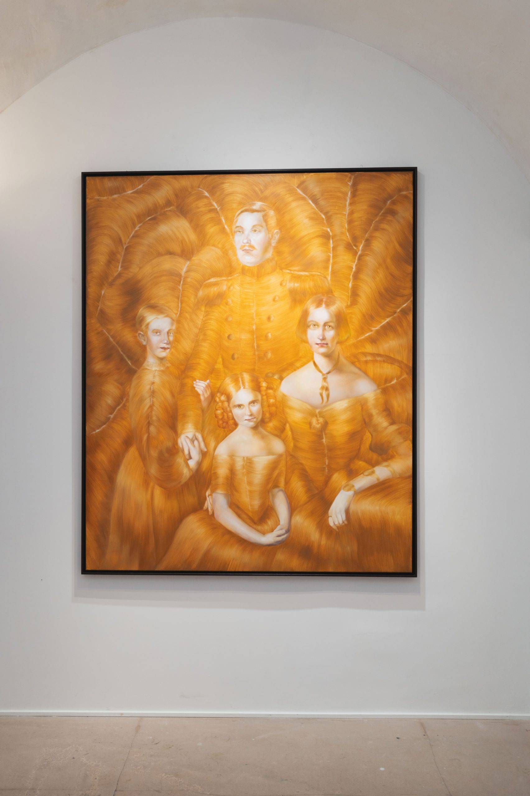 Ces scènes de trophées de chasse font référence aux natures mortes classiques du memento mori. Il s’agit de scènes qui semblent réelles, mais qui, dans leur artificialité, avec leurs distorsions dues à la peinture qui prend son indépendance, ouvrent un lieu inconnu. De même, j’ai voulu représenter une scène de la nature assez typique de la région où j’ai grandi : les marais. Mais la mousse qui court sur les racines de ces arbres est faite de cheveux.
