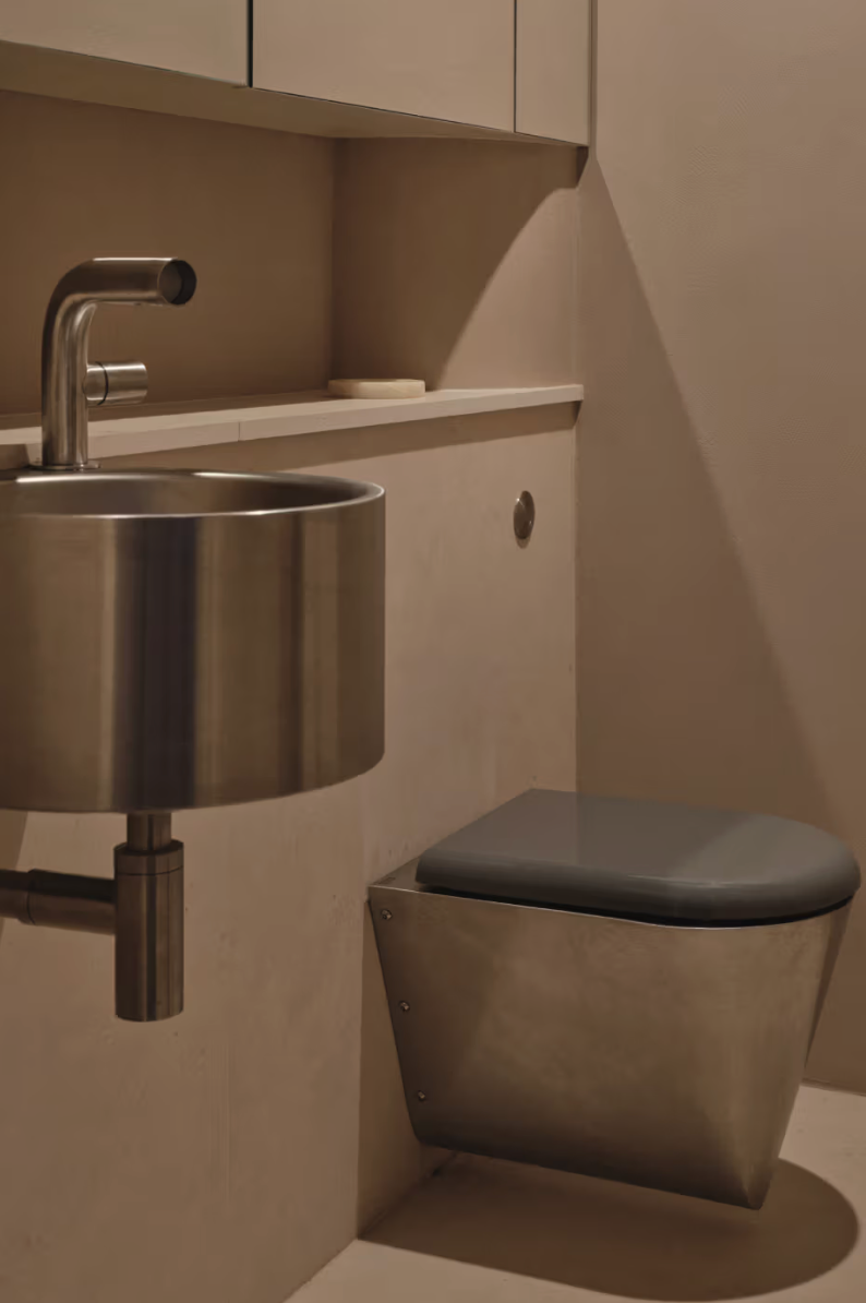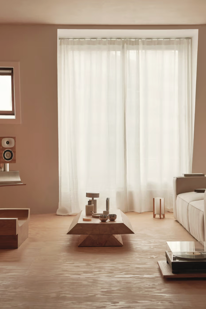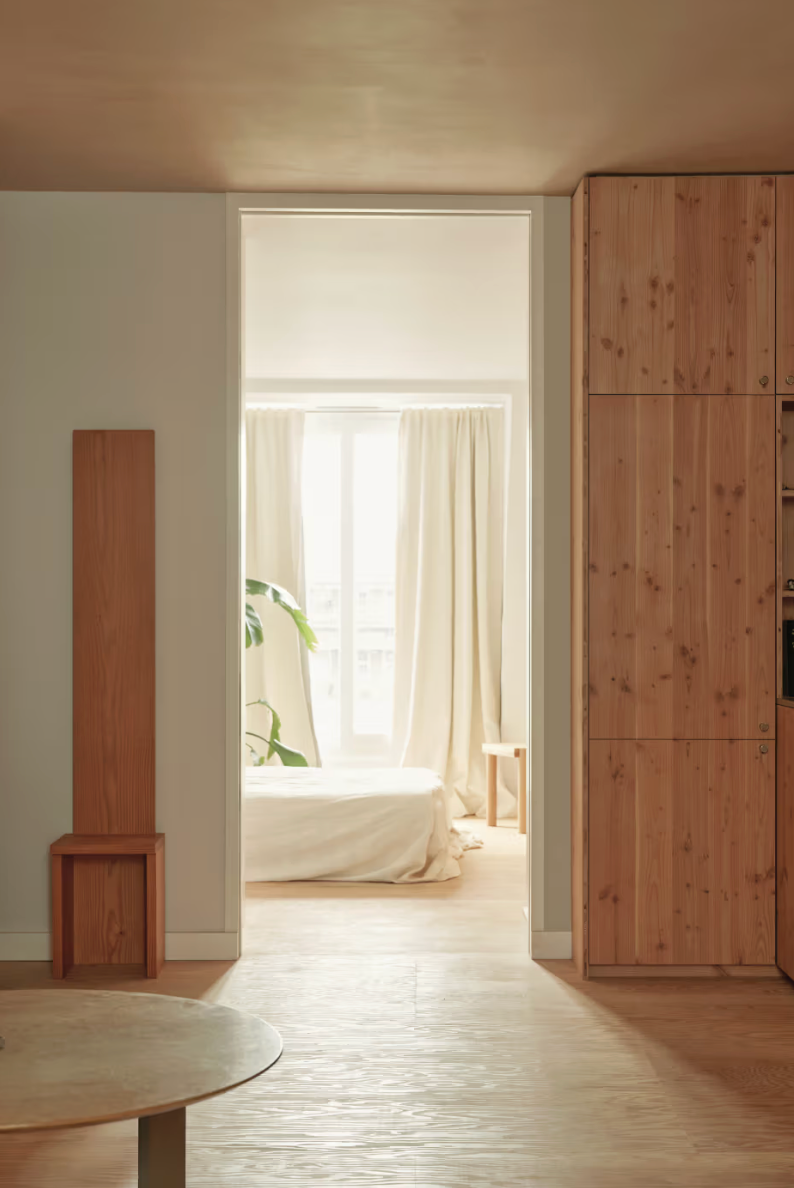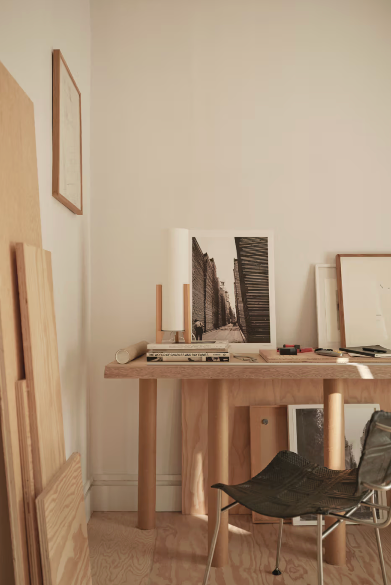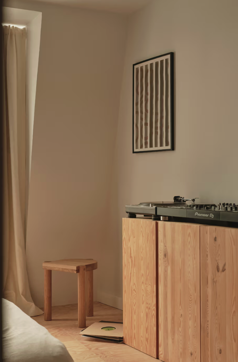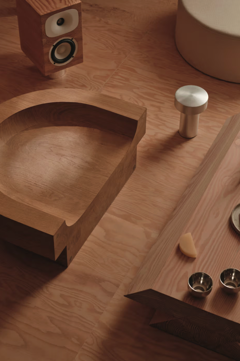 On aimerait s’y installer. La maison de Benni Allan qui donne à EBBA son acronyme, est à la fois sa résidence et un « live-come-showspace » de design expérimental. Organisé autour d’une grande cuisine ouverte aux fonctions dissimulées, l’espace privilégie une atmosphère apaisée avec des enduits bruts et du bois chaleureux. La chambre communique avec la cuisine par une porte coulissante, et un bureau-atelier sert à réinventer des matériaux. L’usage généreux du sapin (murs, sols, ébénisterie) souligne l’intérêt d’Allan pour les matériaux abordables et durables. Des éléments de récupération, comme un parquet en acajou, injectent une dimension narrative, faisant de l’appartement un laboratoire d’idées architecturales. La passion d’Allan pour le mobilier et la musique se manifeste par des pièces sur mesure, comme une table basse préfigurant une future collection EBBA et une enceinte en sapin (en collaboration avec Friendly Pressure et Our Department).