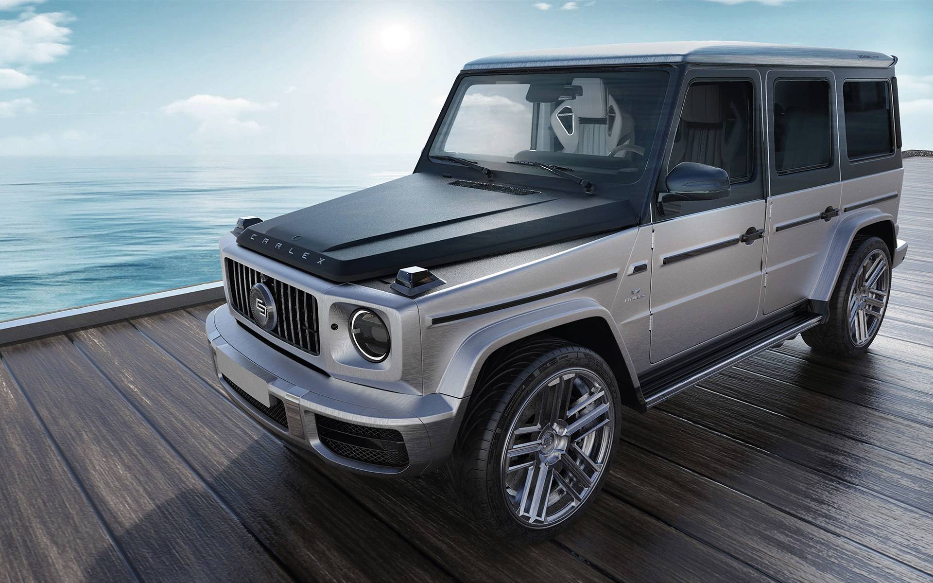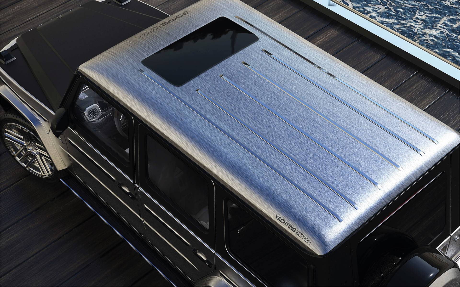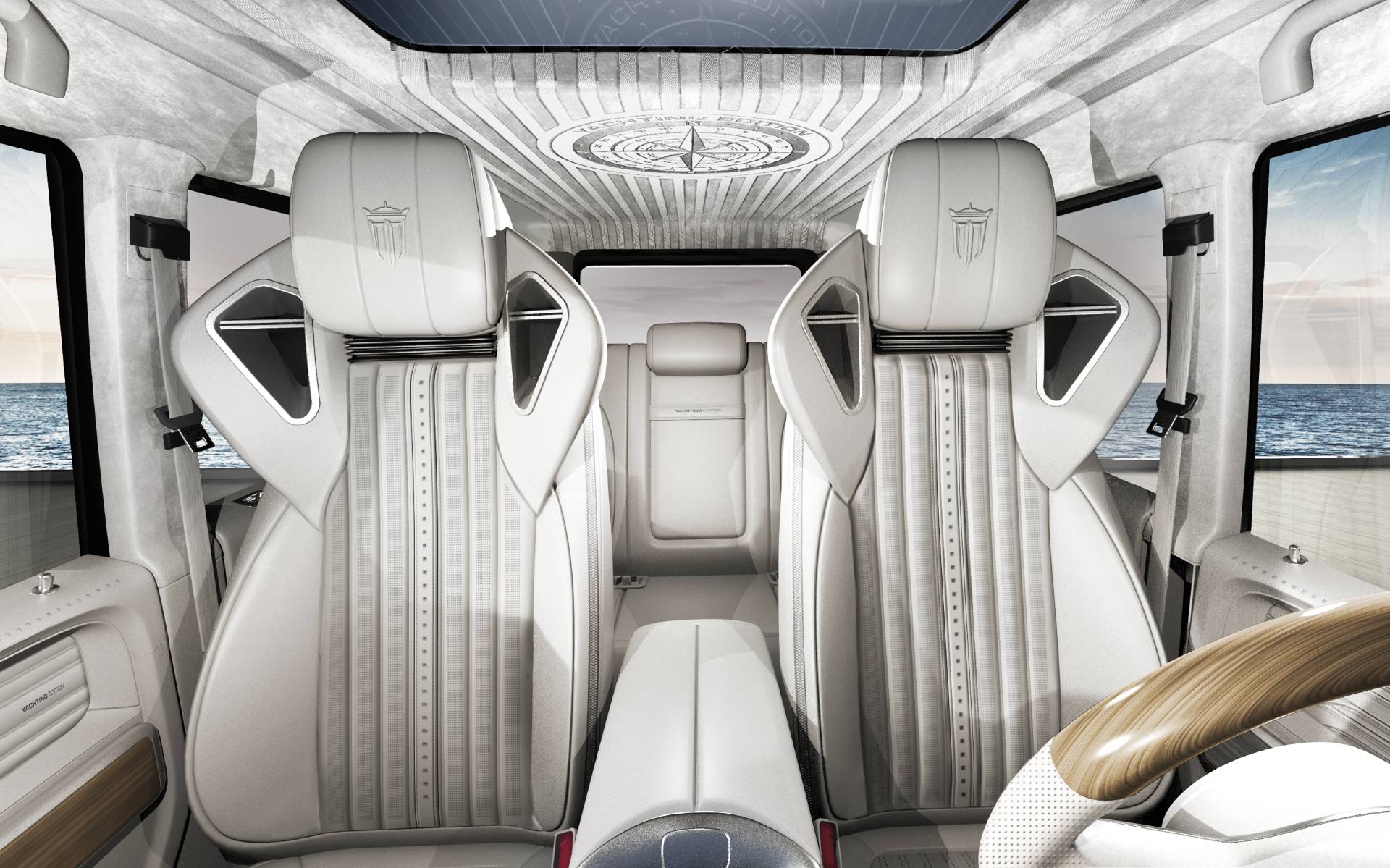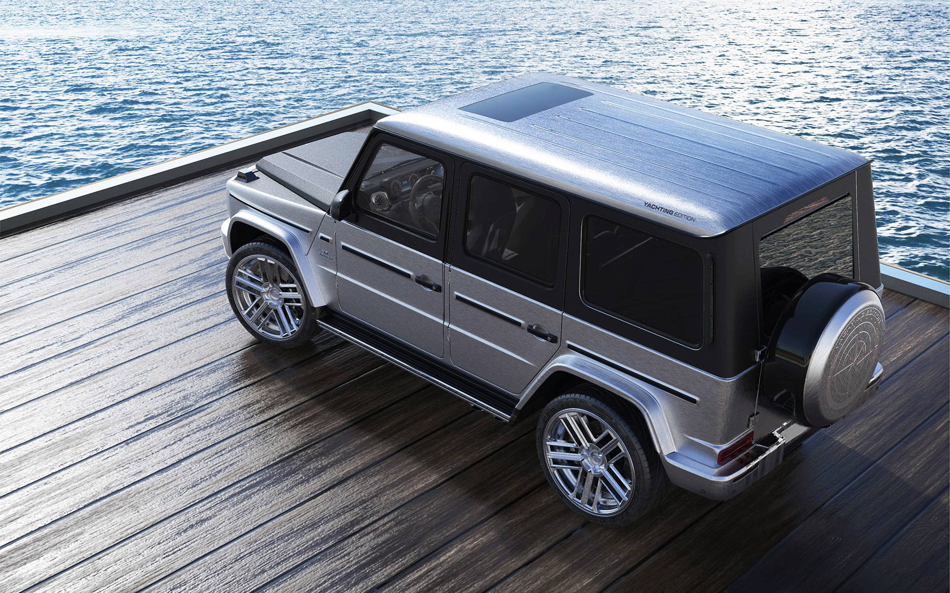 Contre toute attente, il semble que l’univers du 4X4 de baroudeur fasse excellent ménage avec le yachting. Après le land Rover Defender que nous vous présentions il y a quelques semaines, c’est donc au tour du fabuleux classe G de Mercedes d’être destiné à arpenter les marinas. En tous cas c’est la dernière idée du sorcier polonais Carlex, à qui l’on doit nombre de préparations sur le sujet. Si habituellement, on accueille avec prudence ses travaux, force est d’admettre que cette exécution yachting, bleu marine sur inox brossé ne manque pas d’atouts. L’intérieur, tout de cuir blanc et de teck prolonge l’ambiance marine de façon cohérente. S’agissant d’une préparation réalisée sur une base de version AMG (585ch) flirtant avec les 200 000€, prévoyez au moins autant pour bénéficier de ces aménagements…