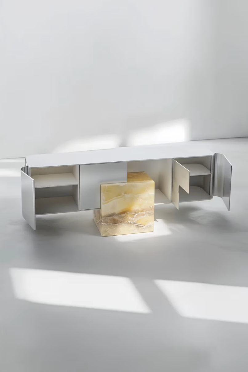 Slash Objects, le studio de design d’Arielle Assouline-Lichten, ouvre son premier espace permanent à SoHo, New York (224 Centre Street) avec l’exposition Between the Lightness and the Darkness. Conçu comme un loft industriel, ce showroom sera une plateforme évolutive pour le design, l’art et la mode, canalisant l’énergie brute du vieux New York. L’exposition présente de nouvelles pièces prolongeant la collection Coexist, explorant l’équilibre des matériaux contrastés. Parmi elles, la Coexist Credenza (aluminium/onyx vert) réalisée avec l’atelier italien Mingardo, et le Coexist Bench (acier inoxydable) et Coexist Mirror (onyx vert). Ces créations marient rigueur industrielle et résonance organique. S’y ajoute l’Adri Chair (acier inoxydable). Ces pièces produites aux États-Unis, en Italie et au Portugal, réaffirment l’engagement du studio pour l’excellence artisanale et poursuivent sa réflexion sur le poids, l’équilibre et le corps dans l’espace.